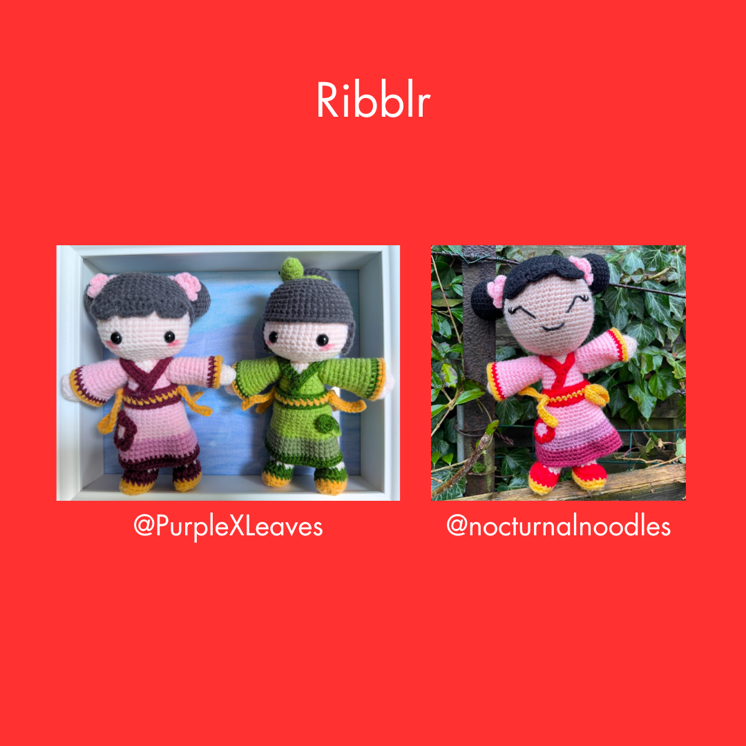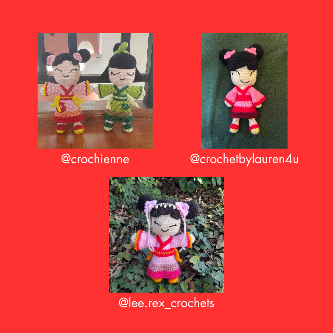 The file includes a crochet pattern of 2 different Hanfu dolls: one in 'Blossom Red', the other in 'Snake Green'. Inspired by the video game 'Splatoon'.