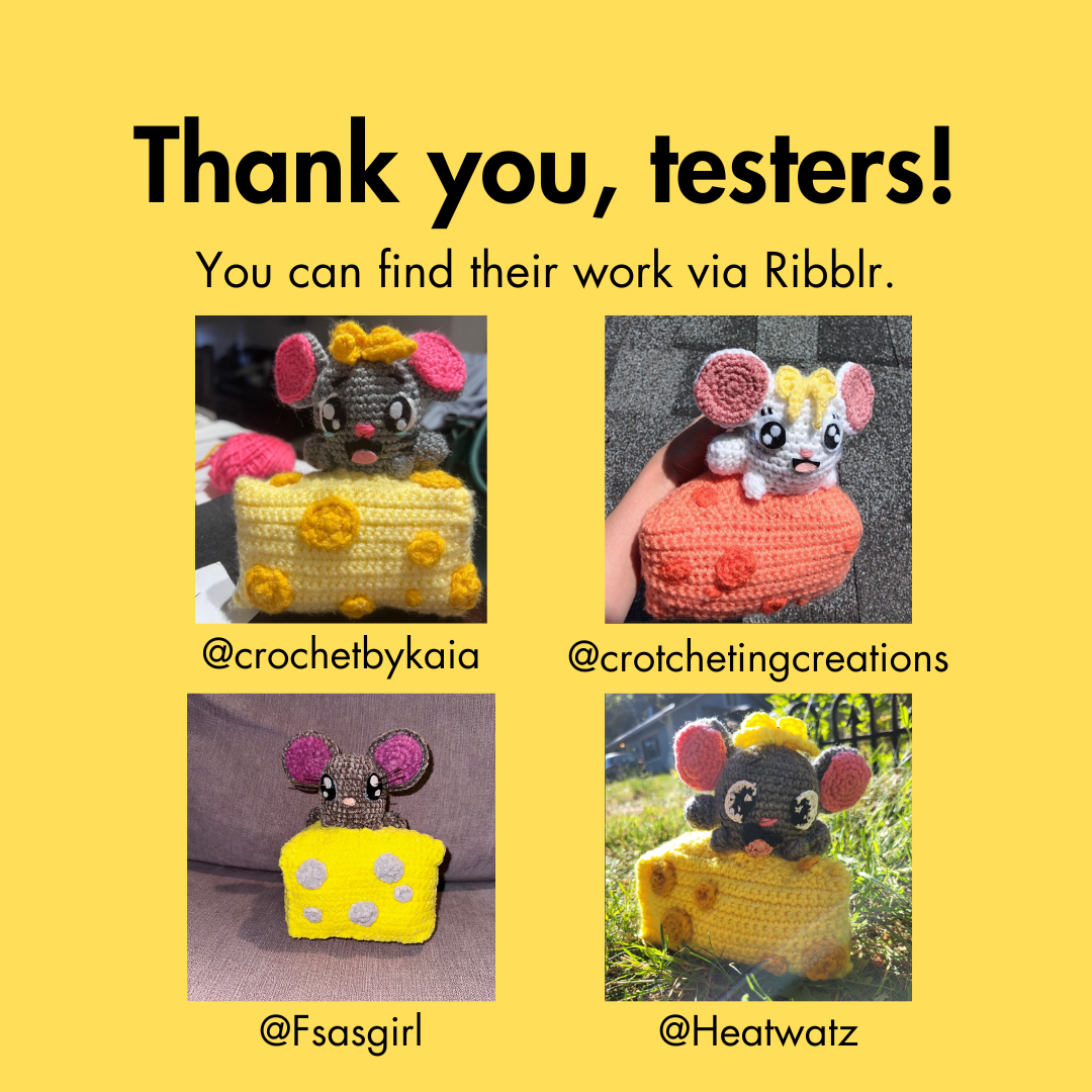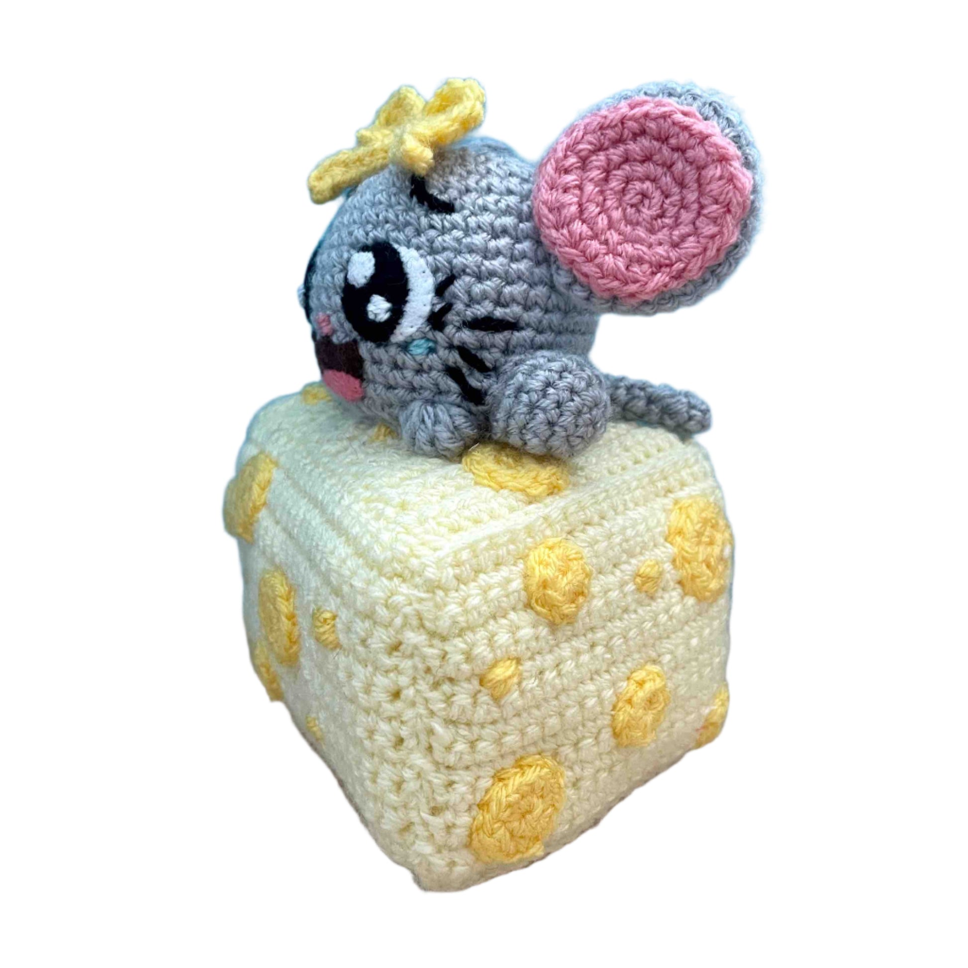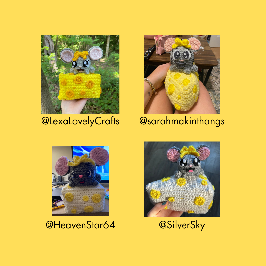 The file includes a crochet pattern, based on a mouse named Charlotte. She's meant to be sitting on a piece of cheese.